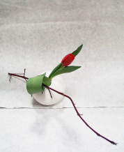 ←球体の花器にチュウリップを一輪。サンゴミズキの枝が転がろうとする器とチュリップを止める