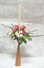 右:キャンドルスタンドに器を取り付けて花を差したアレンジメント。